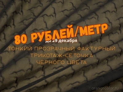 Тонкий, прозрачный, фактурный трикотаж-сеточка чёрного цвета, хорошо тянется, тактильно похож на нейлоновые чулки. Полиэстер 100%, ширина 150 см (на фото кромки слева и справа).