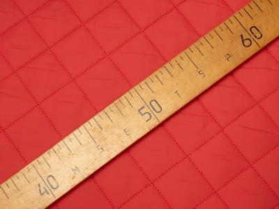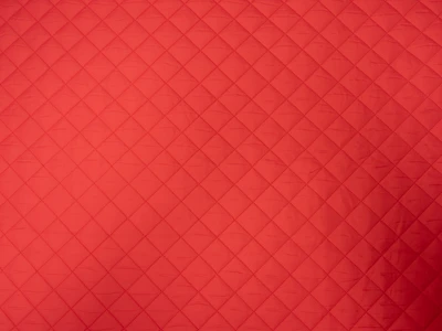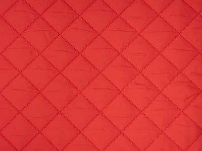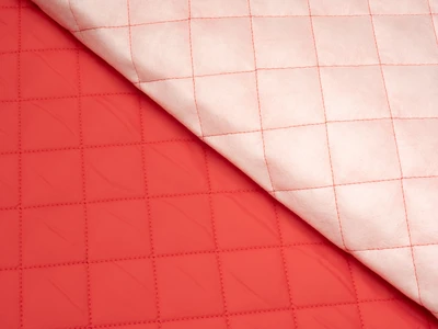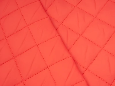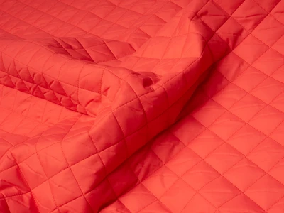 Мягкая, пластичная трёхслойная стёжка квадратами с лицевой стороной из плащевой ткани типа дюспо (с DWR‑покрытием), утеплителем Valtherm 100 г/м² и изнанкой из флизелина. Цвет — насыщенный холодный коралловый, раппорт стёжки — квадраты 3,5×3,5 см. Универсальный материал для лёгких тёплых изделий с выраженной текстурой стёжки. Плотность 250 гр/пог м, полиэстер 100%, ширина 142 см (на фото кромки слева и справа).
