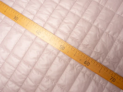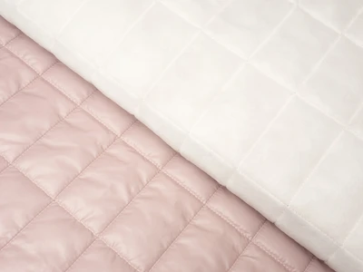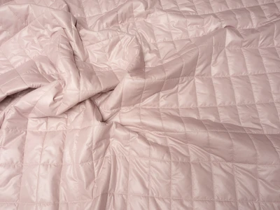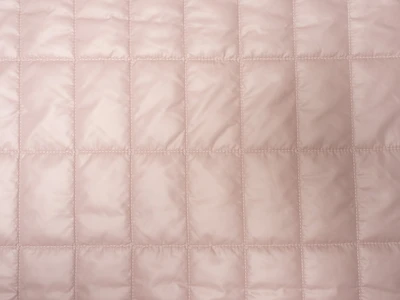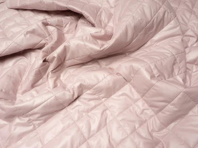 Мягкая пластичная трёхслойная стёжка: лицевая — плащевая ткань с покрытием, тактильно напоминающая кожу, цвет «сухая роза»; утеплитель — холлофайбер 150 г/м²; изнанка — флизелин. Подходит для лёгкой утеплённой верхней одежды и декоративных деталей.