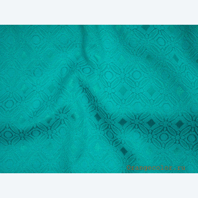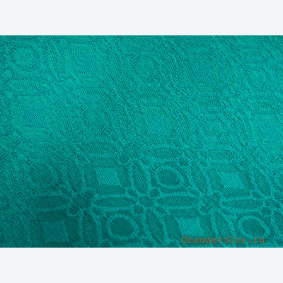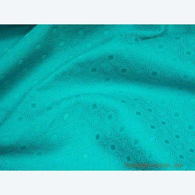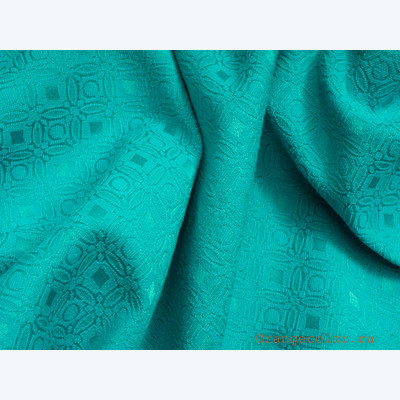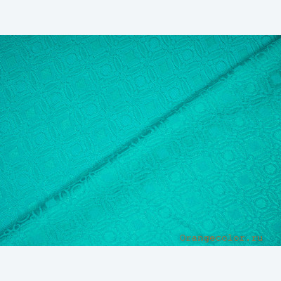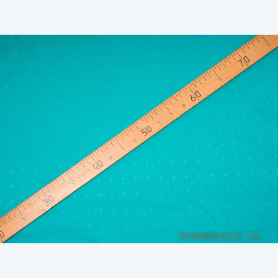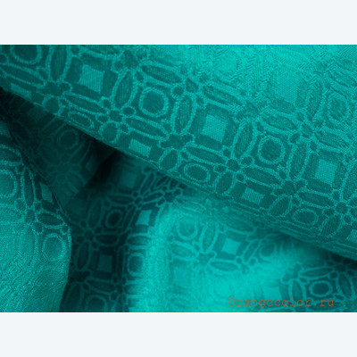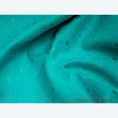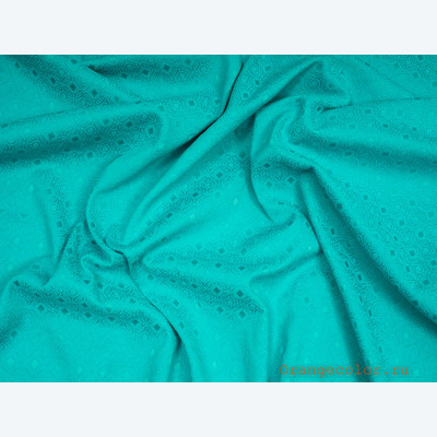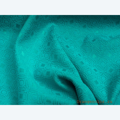 Плотный, пластичный, плательно-костюмный жаккард. Цвет зелёная бирюза, одна сторона матовая, вторая с блеском. Вискоза 60%, полиэстер 35%, эластан 5%. Ширина 134 см (на фото кромки слева и справа).