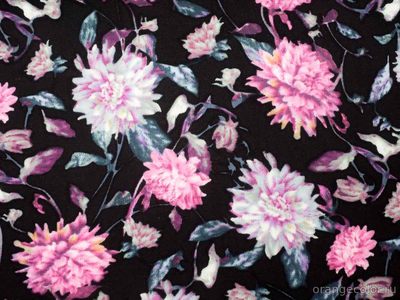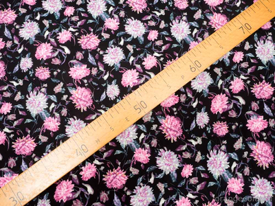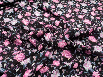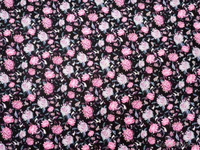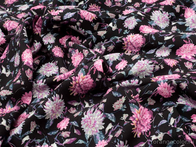 Тонкий, плотный, пластичный и струящийся, блузочно-плательный штапель. Фон чёрный, хризантемы в оттенках серого и розового (холодный тон). Плотность 160 гр/пог м. Вискоза 100%. Ширина 138 см (на фото кромки слева и справа).