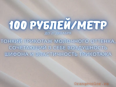 Нежнейший, тонкий трикотаж молочного оттенка, сочетающий в себе воздушность шифона и эластичность трикотажного полотна. Материал невесомый, полупрозрачный, очень мягкий и приятный к телу, отлично тянется, повторяя контуры тела, и возвращается в исходную форму, поверхность матовая и гладкая.